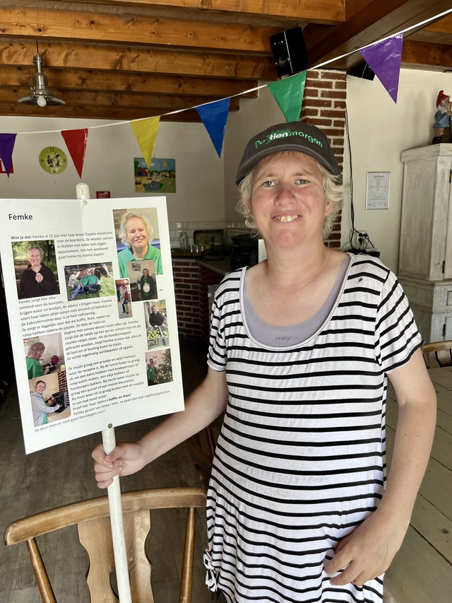 Femke is een vrolijke vrouw van begin 40, Zit lekker in haar vel, ze komt met goede verhalen over de Tienmorgen thuis. Veel voorkomende werkzaamheden van Femke zijn op de kinderboerdij de kleine dieren verzorgen, boodschappen opruimen, fruit en aardappels schillen, de vaatwasser in en uitruimen, koffie en thee zetten voor de pauze en in de groepsaccommodatie de bar met glazen schoonmaken of kastjes poetsen. Verder vind ze het leuk om te zingen en muziek te luisteren. Kinderen voor kinderen luisterd ze graag naar.