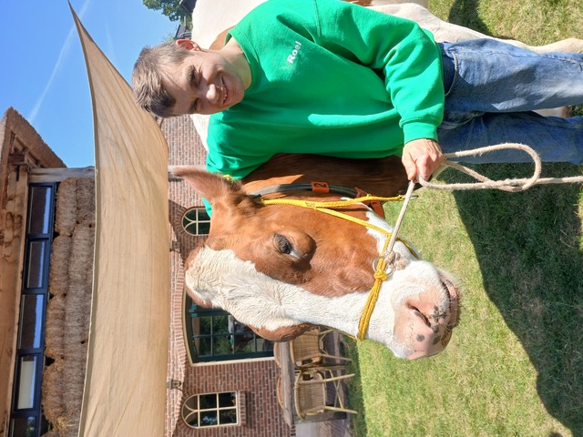 Roel is halverwege de 30 en woont doordeweeks onder begeleiding in Mook. In de weekenden is hij vaak een dag bij zijn ouders. Sinds 2006 werkt hij bij ons op de boerderij, na eerst stage gelopen te hebben. Hij is 4 dagen per week bij ons aan het werk. Hij verzorgt de paarden vaak, een paard is dan ook zijn lievelingsdier hier op de boerderij. Hij helpt met opruimen en poetsen van het huis en de accommodaties. Hij repareert kleine gebreken, ook helpt hij regelmatig in de (moes)tuin mee met bijv. met snoeien, onkruid wieden of poten. Ook vind Roel het leuk om met iemand samen te knutselen aan de speelgoed tractors, skelters of fietsen. Roel vind het sjouwen van zware dingen zoals tegels niet leuk om te doen. Opruimen is iets wat hij wel graag doet en ook heel goed kan, alles bijhouden daar is hij goed in. Dingen zoals schroefjes sorteren, gereedschapsruimte ordenen en de paardenspullen netjes houden vind hij leuk en fijn. Roel vind het werken met Philip en Jo erg leuk, maar als er nieuwe zorgboeren zijn wil hij hier ook graag mee werken. Als het mooi weer is werkt hij graag buiten, als het regent doet hij liever iets binnen. Roel maakt naambordjes voor onze dieren dit is handig voor de kinderen die op vakantie komen.